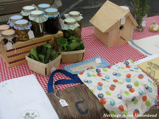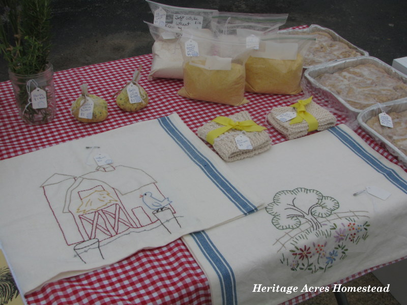 At our table I had the last of the gardens lettuce, strawberry jam, relish, pickled garlic, pickles, homemade vanilla, eggs, handicrafts, whole wheat cinnamon rolls, freshly ground wheat, herbs, garlic and chive butter and a beautiful handmade wooden garbage can. Our garden is still growing so not a lot of produce just yet, but… it was a great day.