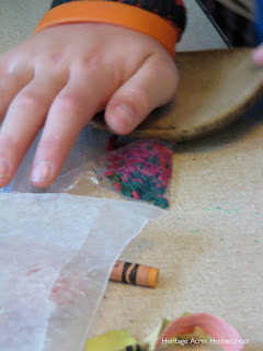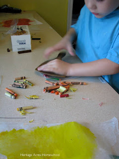 Melting the crayons between the sheets of wax paper with a warm iron.