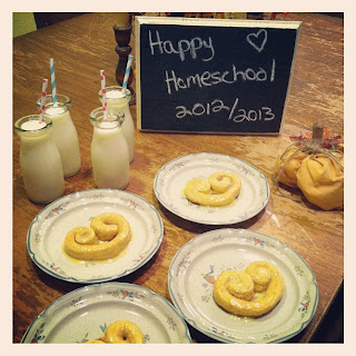 Our first breakfast of the homeschool year. I took our cinnamon rolls and shaped them like hearts… sorta. haha
