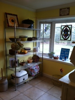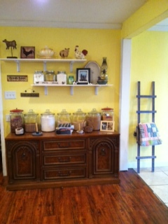 My kitchen area, to me is beautiful, but most importantly it is functional. Much of what I decorate with is useful. Skillets hanging, grains displaying, shelves storing. All purposeful and lovely.