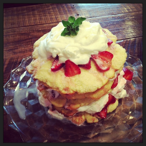 To assemble cake, wait til almost time to serve. Layer cake, strawberries with juice, cream, over and over til you finish off with a cloud of whipped cream and a small smattering of berries. Garnish with mint or edible flowers. This cake is best eaten right away.