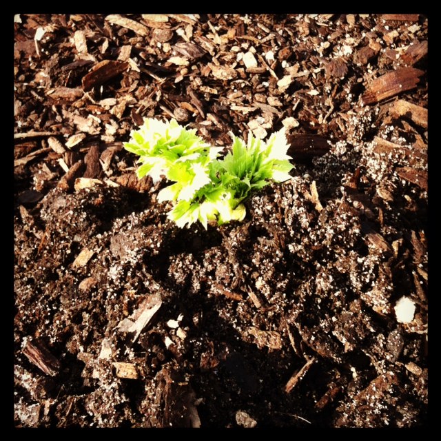 Well, it got tossed to the chickens, but thankfully I had another bunch of organic celery in the fridge. I cut the bottom off the bunch and planted it in the ground.